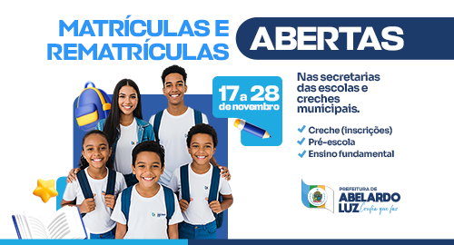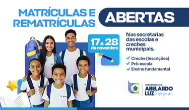 A Secretaria Municipal de Educação informa que estão abertas as matrículas e rematrículas para o ano letivo de 2026, de 17 a 28 de novembro, nas secretarias das escolas e creches municipais.