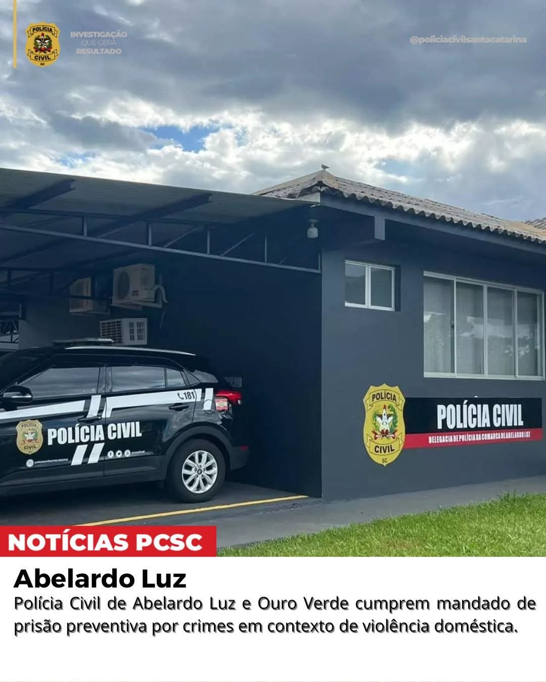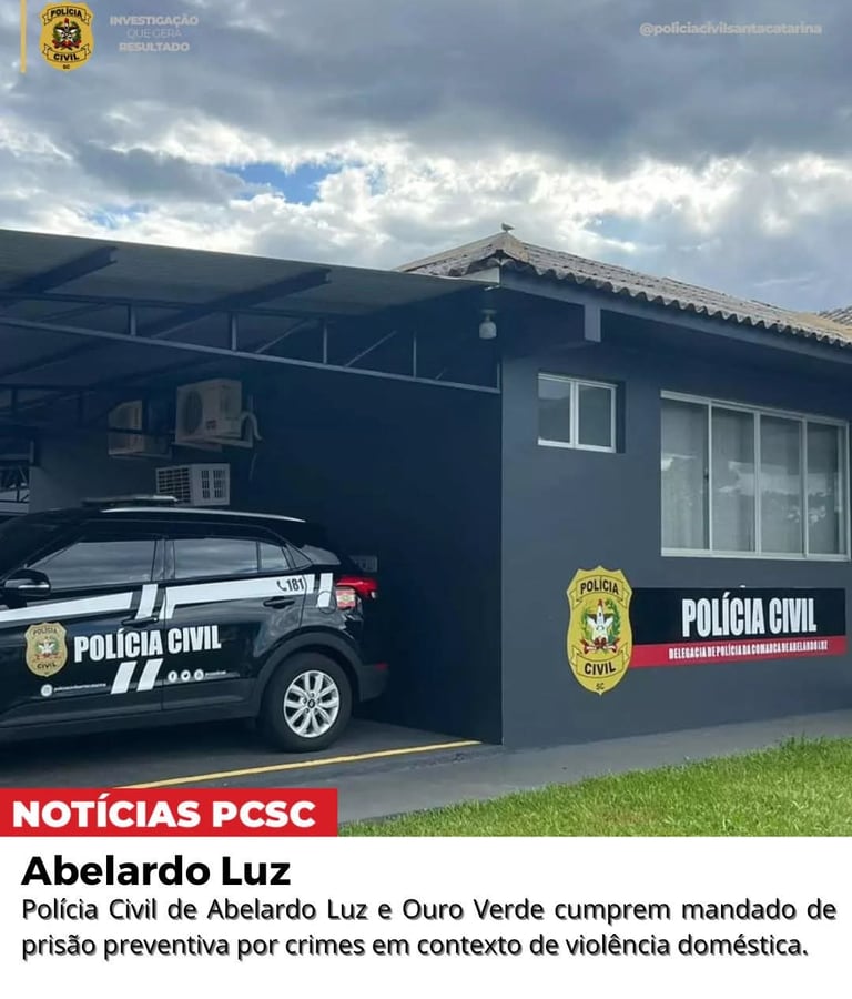 Na data de hoje, 11 de Fevereiro de 2026, a Polícia Civil de Santa Catarina, por meio das Delegacias de Polícia de Fronteira da Comarca de Abelardo Luz e do município de Ouro Verde, cumpriu mandado de prisão preventiva em desfavor de R.V.S., de 26 anos, investigado pelos crimes de lesão corporal, ameaça e descumprimento de medidas protetivas.